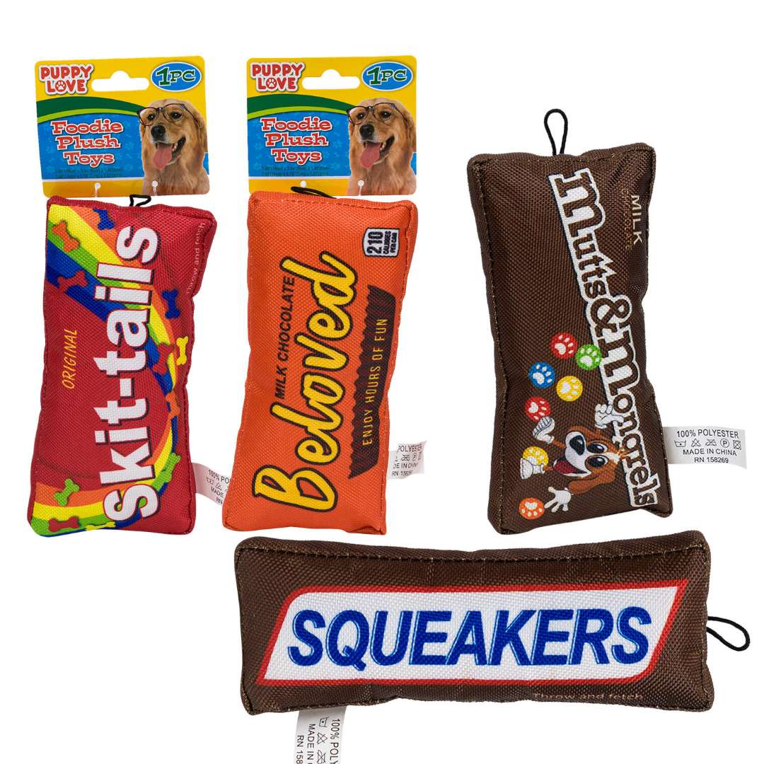 The Famous Candy Pet Toy features 7.08" plush toys in 4 candy-inspired designs. Each includes a squeaker for playful, engaging, and mentally stimulating entertainment.
