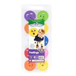 Explore emotions and decorate DIY projects with these Giant Feelings Stampers! This 10-piece set includes 10 different emotion-themed stamps. Each stamp features a large foam shape mounted on a 3" disk for stability and protects little hands from paint and ink. The chunky, rounded handles provide greater comfort and control. Ideal for DIY projects and art and craft time, these giant stampers assist in developing fine motor skills and creativity.
